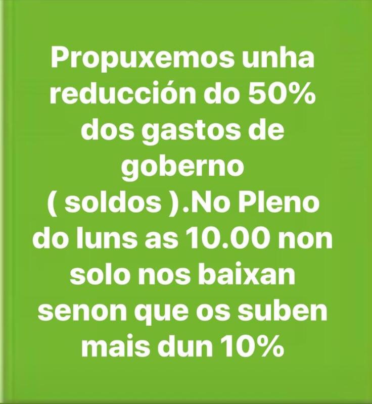 Na pasada campaña electoral dixemos que reduciríamos nun CINCUENTA POR CENTO OS SOLDOS DOS POLÍTICOS ( goberno e gabinete ) porque a DEUDA do Concello NO NO PERMITE e para DAR EXEMPLO. Asi se aforrarían MEDIO MILLÓN DE EUROS EN CATRO ANOS para cousas necesarias.